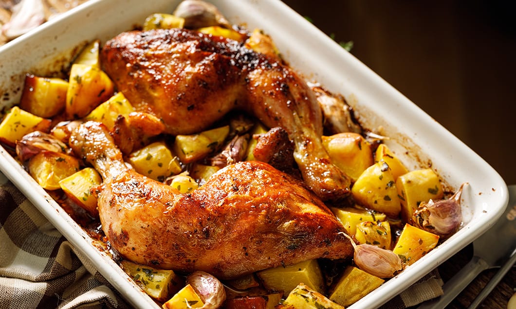 7 Pekač postavimo v ogreto pečico in pečemo približno 50-60 minut ali dokler piščančje meso ni popolnoma zlato rjavo zapečeno in hrustljavo, krompir mehek in lepo zapečen.