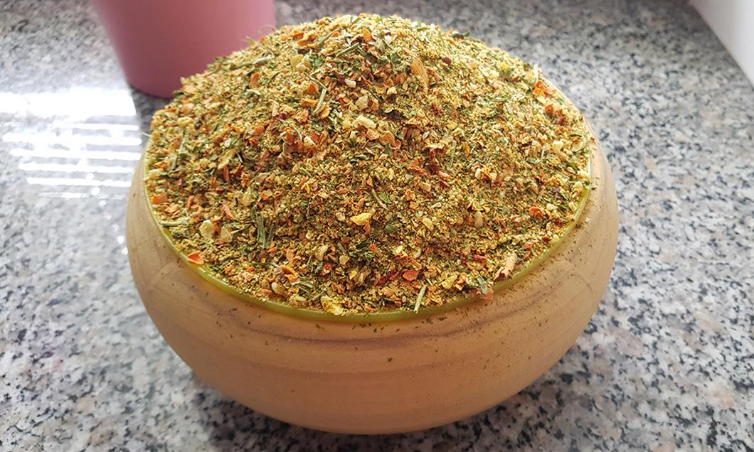 2Suho zelenjavo zmeljemo v multipraktiku, nato pa jo v primerno veliki posodi dobro zmešamo s soljo in kurkumo. Shranimo jo v sterilne steklene kozarce.