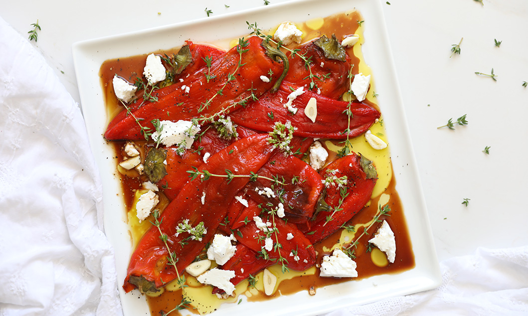 3Ohlajenim paprikam odstranimo počrnelo kožico, vsako papriko ob strani zarežemo in previdno odstranimo seme. Peclje pustimo. Zložimo jih v servirno skledo, prelijemo s solatnim prelivom in previdno premešamo.