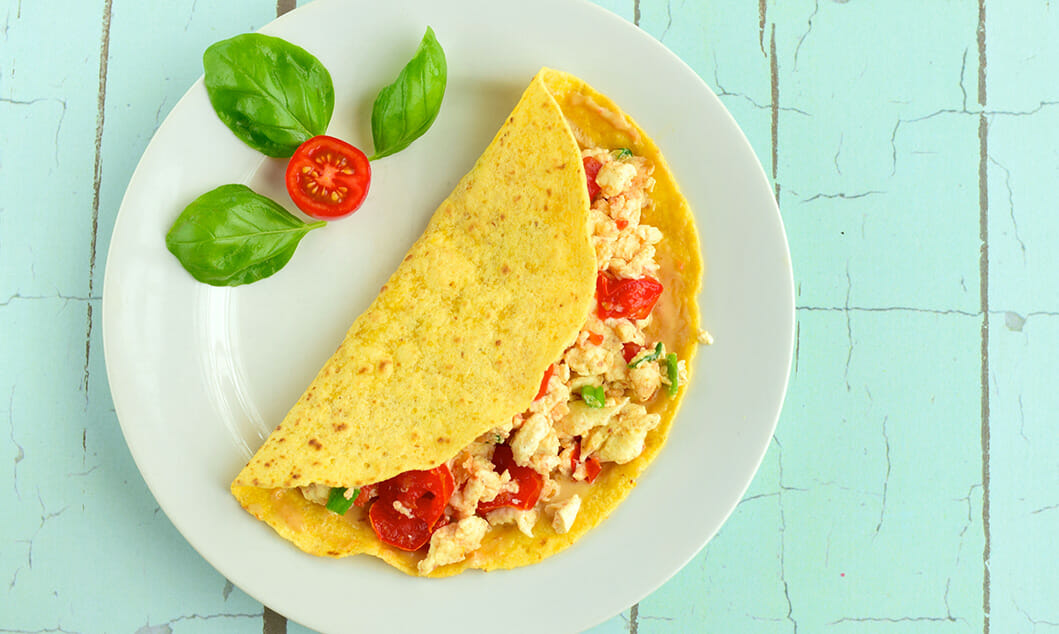 1Tortiljo pogrejemo na ponvi, jo napolnimo z umešanimi jajci in ostalimi sestavinami, zavijemo in za nekaj minut zavito postavimo nazaj na ponev tako, da je rob tortilje na spodnji strani in jo malce zapečemo, da se med jedjo ne odpre.