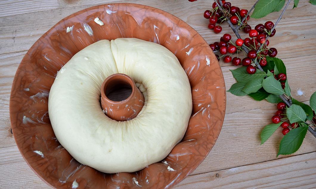 6Nato testo zvijemo in poloลพimo v dobro namazan model, da vzhaja. Sedaj ga premaลพemo s stepenim beljakom in peฤemo v srednje vroฤi peฤici 1 uro.