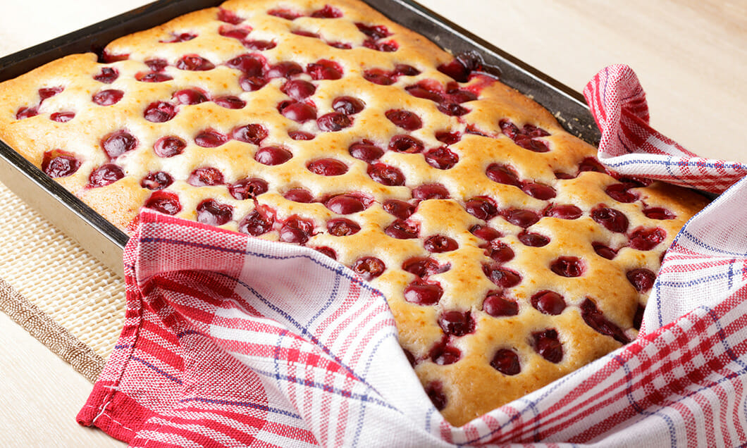 4Maso vlijemo v pekač in po njej razporedimo višnje.