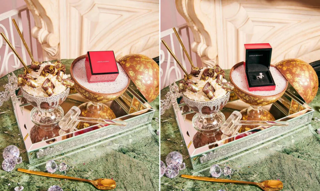 Drugi del sladice naj bi bil v obliki pozlačene čokoladne krogle, napolnjene z užitnimi, diamantom podobnimi kristali. Na teh diamantih bo počivala škatlica z diamantnim prstanom, ki ga je oblikovala Lorraine Schwartz. V prstan iz belega zlata sta vdelana 0,69-karatni rožnati in 0,77-karatni modri diamant, obkroža pa ju še za 1,15 karata belih diamantov.
